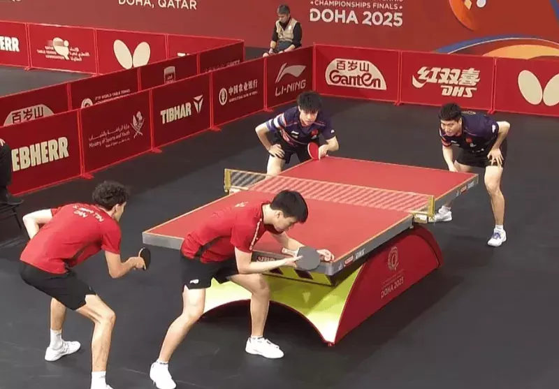 多哈世乒赛一场男双64强赛中,梁靖崑/黄友政组合以3-0顺服加拿大组合李元璋/马丁,晋级下一轮。